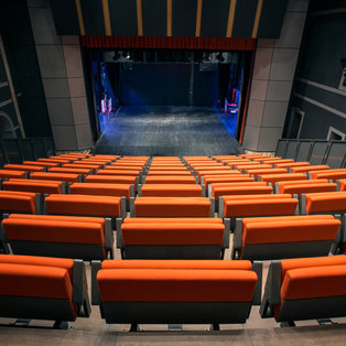 The Auditorium, located in the former monastery garden, shares the stage with the Great Hall by opening a metal curtain. The stage is suitable for music, theatre and dance performances and the outdoor grandstand, above which a mighty oak tree stands, can seat 520 viewers.